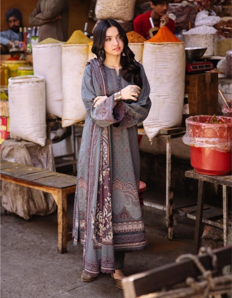 This three-piece ensemble features a digitally printed black lawn shirt adorned with intricate pink and white floral patterns, complemented by matching lace detailing on the neckline and sleeves. The outfit is paired with a vibrant, patterned dupatta that echoes the floral motifs and a dyed cotton trouser. Perfect for festive occasions, it blends traditional design with contemporary style.