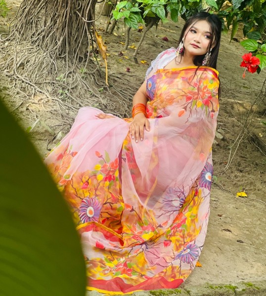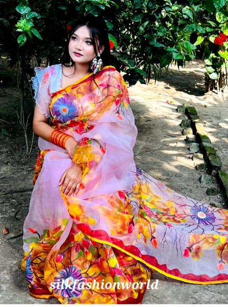 Rajshahi Muslin Silk Hand Paint Saree With Attached Unstitched Blouse Piece