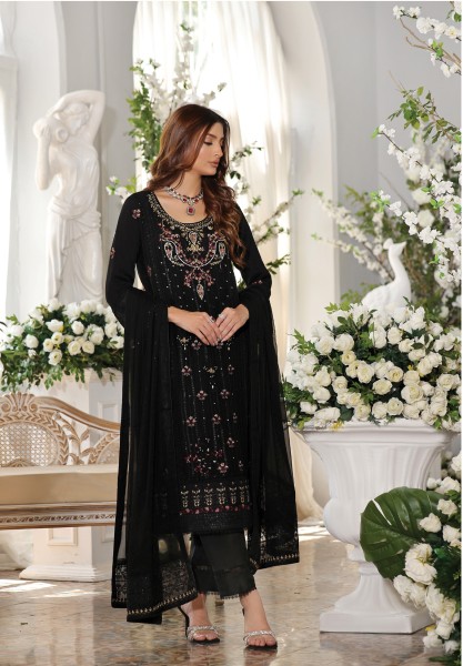The Guzel Jahanara Stitched 3 Piece Festive Formals Chiffon in Black exudes timeless elegance and sophistication. This luxurious 3-piece set includes a beautifully stitched shirt, trousers, and a matching dupatta, all crafted from premium chiffon. The classic black hue is enhanced with intricate embroidery and embellishments, making it perfect for weddings, parties, and festive occasions. The lightweight, breathable fabric ensures comfort while adding a touch of glamour to your look.