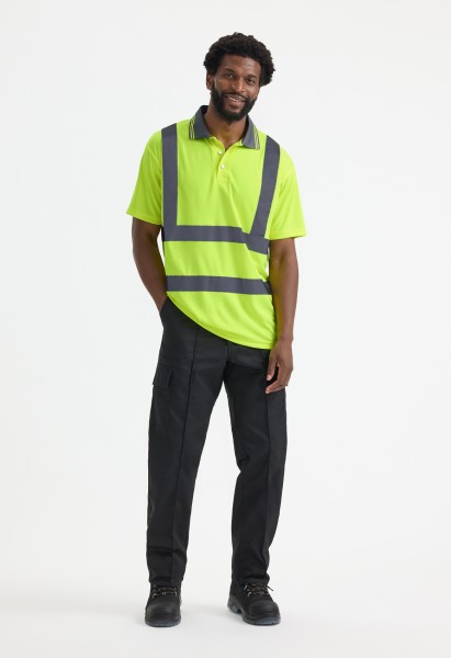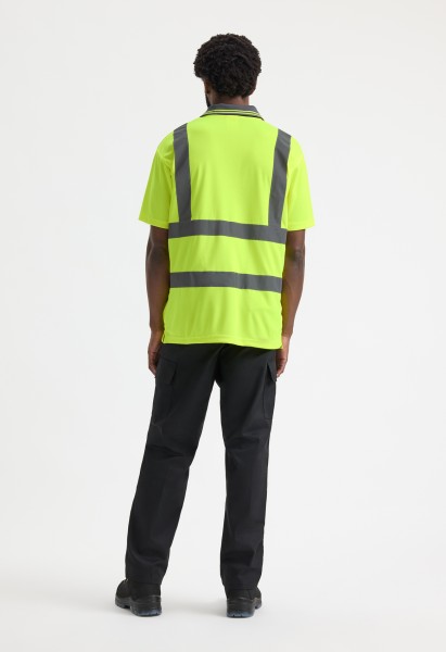 This high-visibility garment is EN ISO 20471 Class 2 approved, UKCA and CE certified, and meets PPE regulations. Made from 100% recycled breathable polyester with wicking properties, it keeps the wearer cool and dry. It features a ribbed contrast collar, a three-button placket, 40+ UPF protection, and reflective strips for safety. Washable up to 25 times.