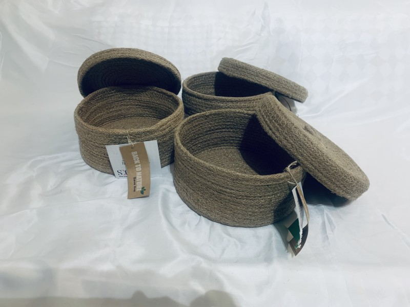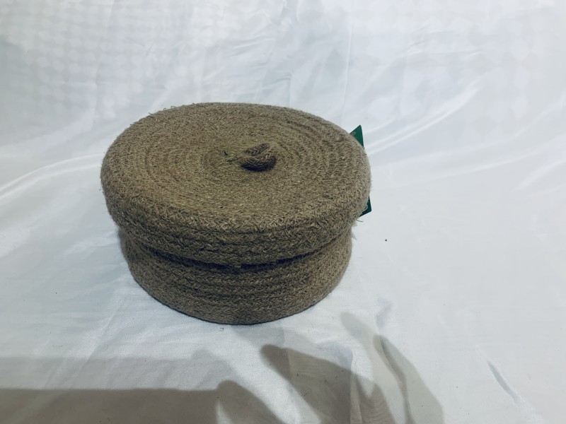 Made from jute. 20cm diameter and 10cm height. Useful for small stuff/ ornaments storage.